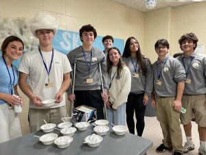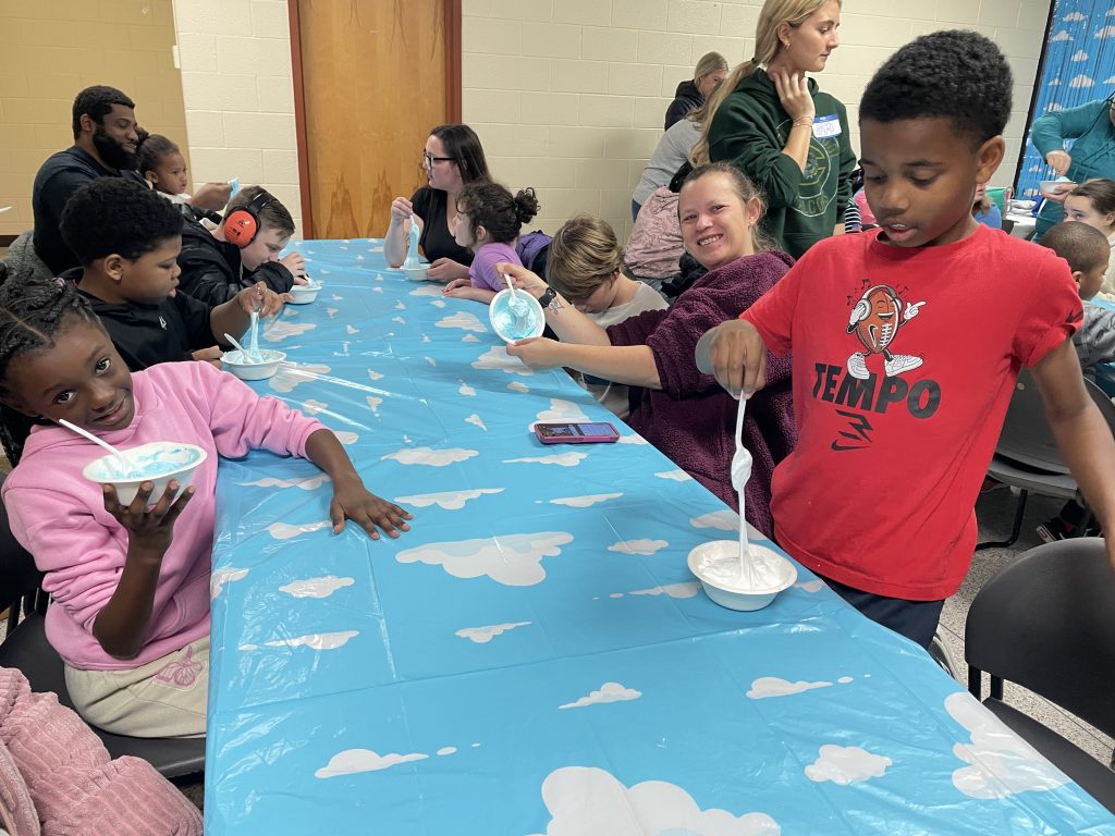 The special guests made clouds out of shaving cream and blue food dye.