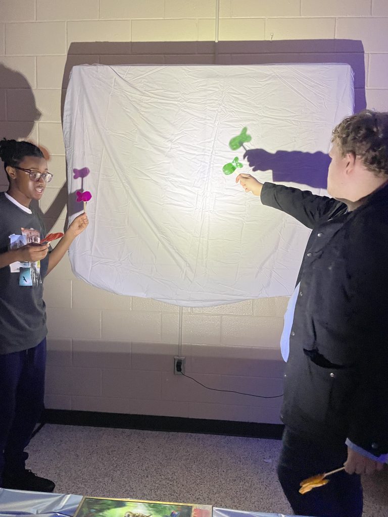 The book “Rainbow Fish” was highlighted in the “Under-the-Sea” visual room. The lights were dimmed so visitors could project fish silhouettes onto a screen.