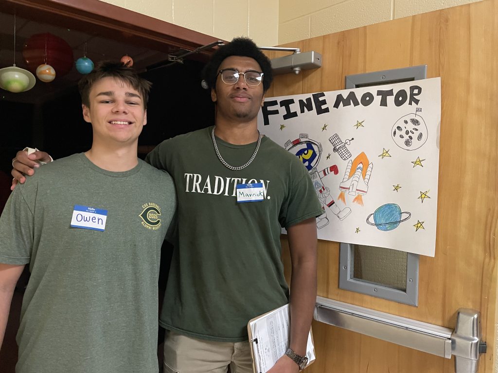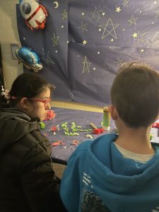 They practiced fine motor skills in the Outer Space area featuring the book “Pete the Cat: Out of This World.”
