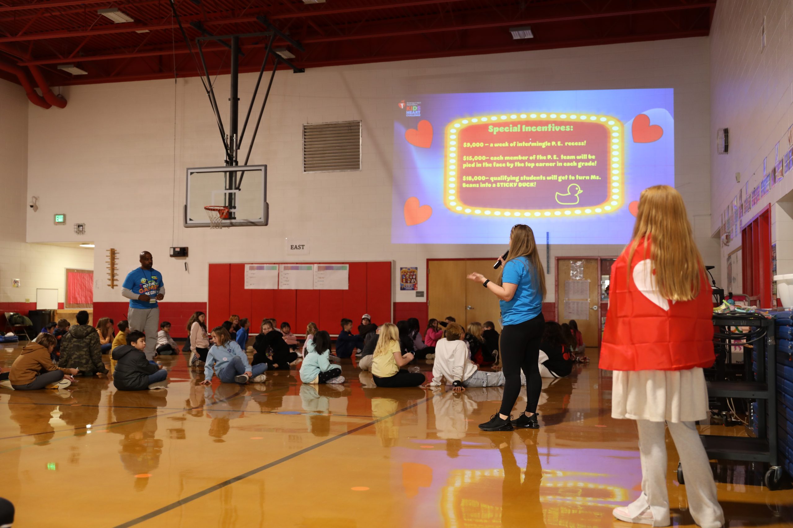 During the assembly, Abby passed out prizes to students who answered questions about healthy habits. She then shared her story, asking students: “Did you know your heart is one of the most important parts of your body?”