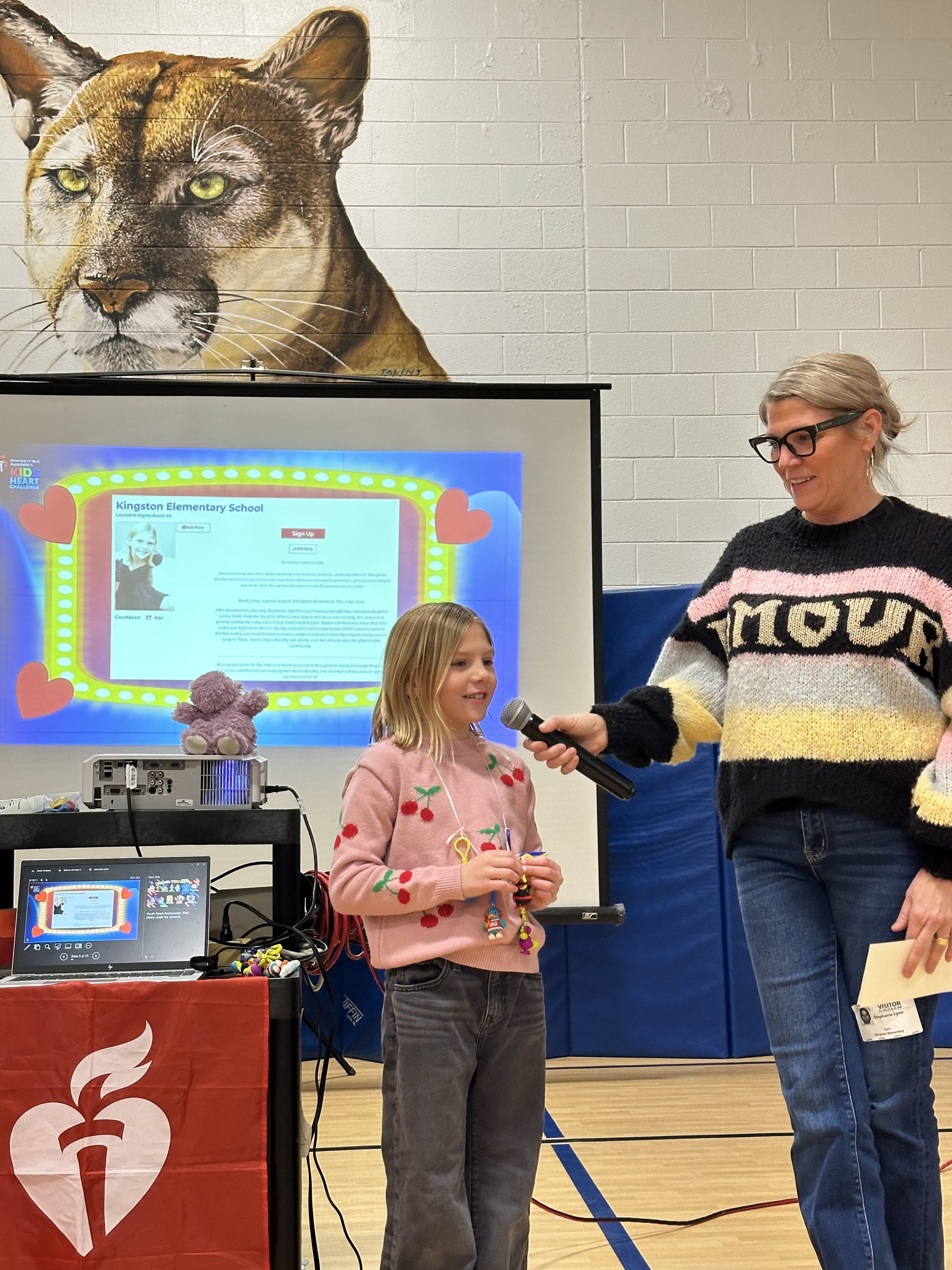 At Kingston Elementary, third grader Laney Lyon and mom Stephanie Lyon helped kick off the Kids Heart Challenge with the American Heart Association. Laney had open heart surgery at just 2 weeks old. Now she helps to raise awareness about how students can help