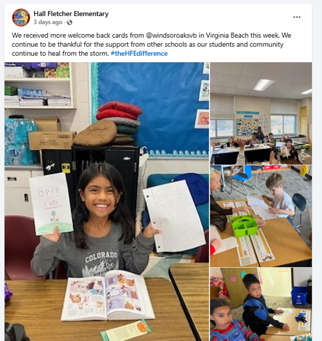 Messner asked teachers at Windsor Oaks to have their students make cards and write letters. She then mailed the well wishes to Hall Fletcher Elementary.